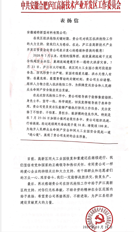 洪水無情人有情,心懷感恩勵志行。在已經(jīng)過去的抗洪搶險工作中,安徽瑞特公司全體工作人員充分發(fā)揚了不怕苦、不怕累、勇?lián)?dāng)、敢拼搏的優(yōu)良作風(fēng),出色完成了此次抗洪搶險任務(wù),得到了合肥廬江縣高新技術(shù)產(chǎn)業(yè)開發(fā)區(qū)高度認(rèn)可,并為安徽瑞特送來了表揚信。