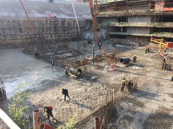 在清脆且規(guī)律的泵送聲伴奏下,一方又一方混凝土按照項目的要求注入指定區(qū)域,蚌埠建材主要領導深入澆筑一線,實地指導澆筑工作,并慰問所有生產參與人員;質量管理人員也按照預定澆筑方案對各種原材料實施定期檢測,并對不同時段的入場混凝土進行測溫記錄工作;隨著統(tǒng)計數(shù)據(jù)顯示1000 m3、2000 m3……的持續(xù)攀升,器材部門加強原材料調配力度,組織各種原材料有序進場,以保證生產平穩(wěn)推進;設備管理人員多頻次檢查設備運行狀況,確保設備運行正常。在總方量澆筑過半以后,生產人員結合現(xiàn)場實際情況,與項目管理人員充分溝通,針對現(xiàn)場道路的客觀因素,將第四臺備用泵送設備及時調配到位,干脆利索的完成一次時間差,確保近三千平方澆筑面積全覆蓋,避免出現(xiàn)冷縫這一惡性質量事故的發(fā)生,此項舉措獲得了項目的高度評價,4月28當天也創(chuàng)下了單日4488 m3的歷史最高澆筑記錄。