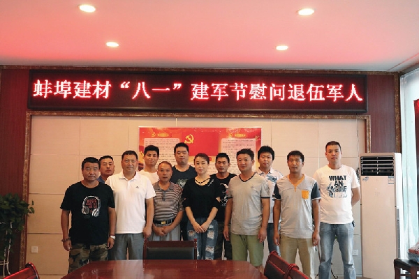 2017年8月1日,在中國人民解放軍建軍90周年紀(jì)念日到來之際,蚌埠建材黨支部副書記沙薇莉代表公司慰問退伍軍人員工,向他們發(fā)放慰問物品,并致以節(jié)日的問候和誠摯的祝福。目前公司在冊退伍軍人員工共有13人,他們曾經(jīng)身披戎裝、戍邊衛(wèi)國,部分退伍軍人員工的兵齡更是長達(dá)十幾年。