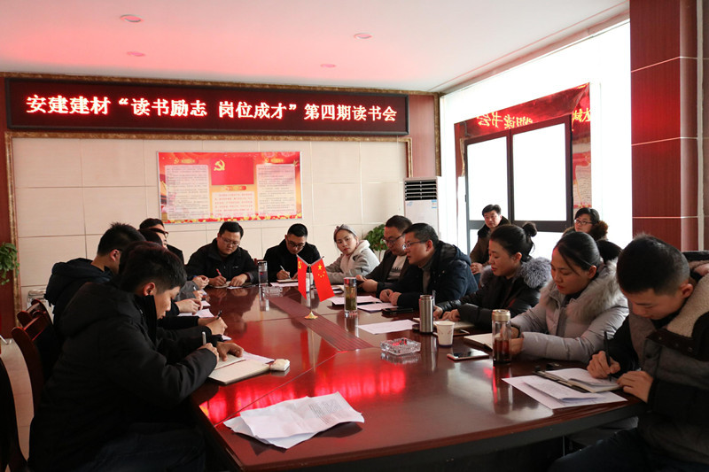 2017年12月12日下午,由安建建材團(tuán)委主辦、蚌埠建材團(tuán)支部承辦的“讀書勵(lì)志 崗位成才”第四期讀書會(huì)活動(dòng)在蚌埠建材一樓會(huì)議室順利開展,蚌埠建材黨支部書記陶良敬,副書記沙薇莉參加了本次活動(dòng),安建建材團(tuán)委書記馬衛(wèi)華到會(huì)指導(dǎo)。