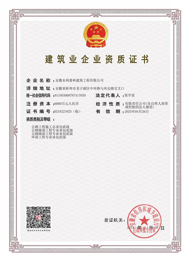 至此,嘉和建筑已擁有建筑、市政、公路工程總承包貳級資質(zhì)3項,擁有環(huán)保工程、公路路面工程、公路路基工程專業(yè)承包貳級資質(zhì)3項,資質(zhì)等級結(jié)構(gòu)大為改善,資質(zhì)體系不斷優(yōu)化完善。