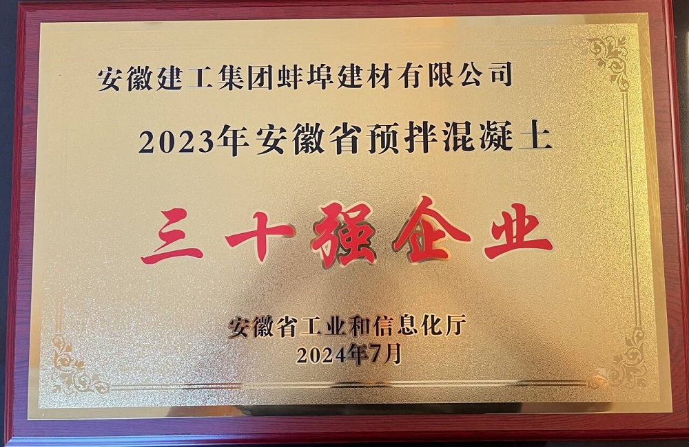 近日,安徽省經(jīng)濟(jì)和信息化廳公布了2023年安徽省預(yù)拌混凝土企業(yè)30強名單,安徽建工集團(tuán)蚌埠建材有限公司再次成功入圍,榮獲安徽省預(yù)拌混凝土企業(yè)30強。