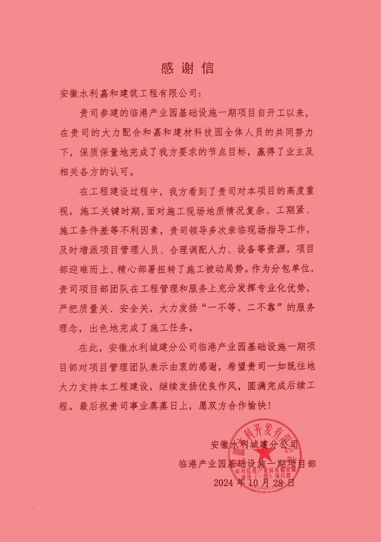 10月28日,嘉和建筑參建的臨港產(chǎn)業(yè)園基礎(chǔ)設(shè)施一期項(xiàng)目收到業(yè)主感謝信,對(duì)項(xiàng)目施工進(jìn)度、施工質(zhì)量及項(xiàng)目團(tuán)隊(duì)表示充分肯定,對(duì)項(xiàng)目團(tuán)隊(duì)在過(guò)程中展現(xiàn)出的良好工作作風(fēng)表示高度贊賞和肯定。