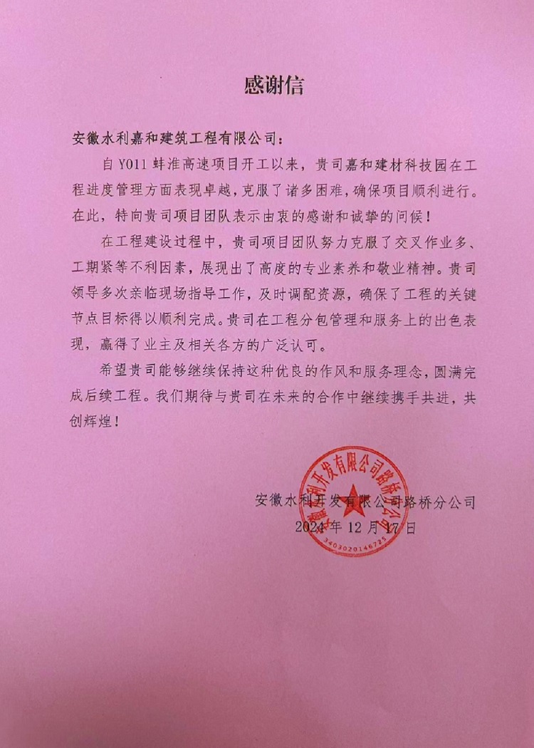 近期,嘉和建材科技園順利完成Y011蚌淮高速項(xiàng)目路面瀝青攤鋪施工主體任務(wù)。12月17日,嘉和建筑再次收到業(yè)主表?yè)P(yáng)信,對(duì)Y011蚌淮高速項(xiàng)目施工進(jìn)度、施工質(zhì)量及項(xiàng)目團(tuán)隊(duì)表示充分肯定,對(duì)項(xiàng)目部在過(guò)程中展現(xiàn)出的良好工作作風(fēng)表示高度贊賞和肯定。
