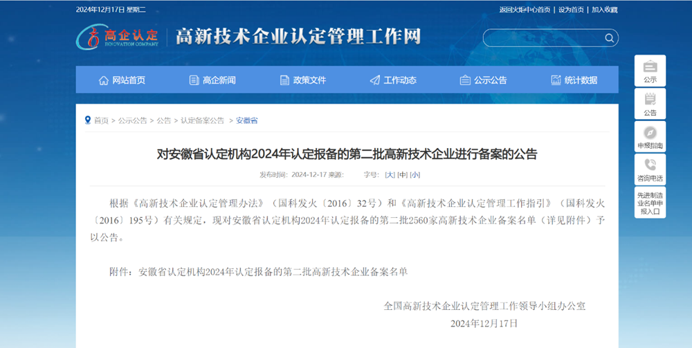 12月17日,國家高新技術(shù)企業(yè)認(rèn)定管理工作網(wǎng)發(fā)布《對(duì)安徽省認(rèn)定機(jī)構(gòu)2024年認(rèn)定報(bào)備的第二批高新技術(shù)企業(yè)進(jìn)行備案的公告》,建工建材安徽瑞特公司名列其中,成功獲評(píng)國家“高新技術(shù)企業(yè)”。此次通過國家“高新技術(shù)企業(yè)”認(rèn)定,為建工建材注入了強(qiáng)勁的發(fā)展新動(dòng)力。