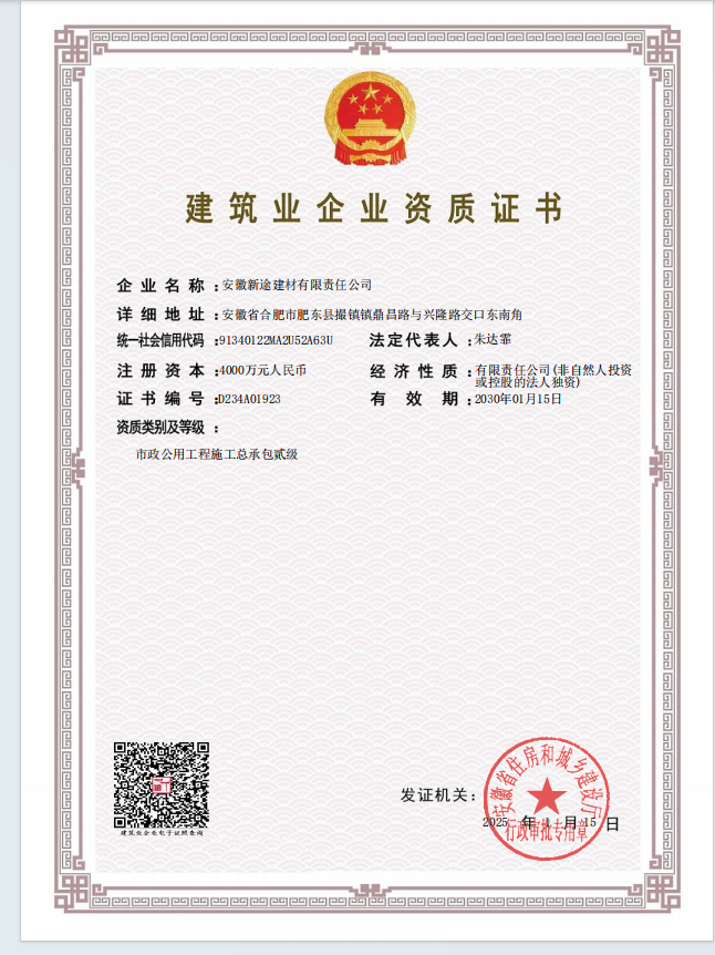 2025年1月15日,安徽新途建材有限責(zé)任公司喜獲安徽省住房和城鄉(xiāng)建設(shè)廳正式批準(zhǔn),市政公用工程施工總承包二級資質(zhì)順利通過審核。標(biāo)志著新途建材在市政公用工程領(lǐng)域邁上了新的臺階,市場競爭力得到顯著提升,為公司的業(yè)務(wù)范圍拓展奠定了堅實的基礎(chǔ)。