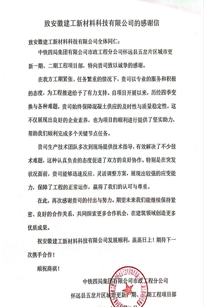 建工建材憑借其卓越的產(chǎn)品質(zhì)量、高效的供應(yīng)體系以及出色的服務(wù)保障表現(xiàn)、一絲不茍、精益求精的工作精神,收到了來自中國(guó)電子、中國(guó)中鐵等央國(guó)企的感謝信。