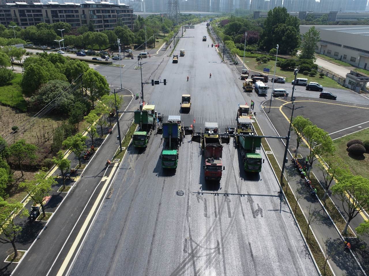 此次施工面積達(dá)34480平方米。為確保工程高效、高質(zhì)量完成,新途建材共計(jì)投入15臺(tái)攤鋪設(shè)備齊上陣,其中包括四臺(tái)攤鋪機(jī)、三臺(tái)鋼輪壓路機(jī)和四臺(tái)膠輪壓路機(jī)。四臺(tái)攤鋪機(jī)協(xié)同作業(yè),實(shí)現(xiàn)“四機(jī)連鋪”,大幅提高了攤鋪效率,保證了攤鋪的平整度和均勻性;多臺(tái)壓路機(jī)緊密配合,對(duì)攤鋪后的瀝青進(jìn)行反復(fù)碾壓,確保路面壓實(shí)度符合標(biāo)準(zhǔn)。