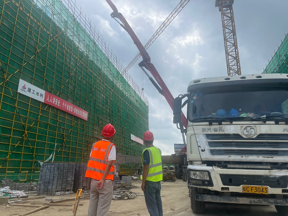 淮上站生產(chǎn)組長(zhǎng)楊國(guó)威頭頂烈日巡查,既檢查設(shè)備作業(yè)安全性,又密切關(guān)注倉(cāng)面澆筑情況,用細(xì)致守護(hù)現(xiàn)場(chǎng)安全與施工質(zhì)量。