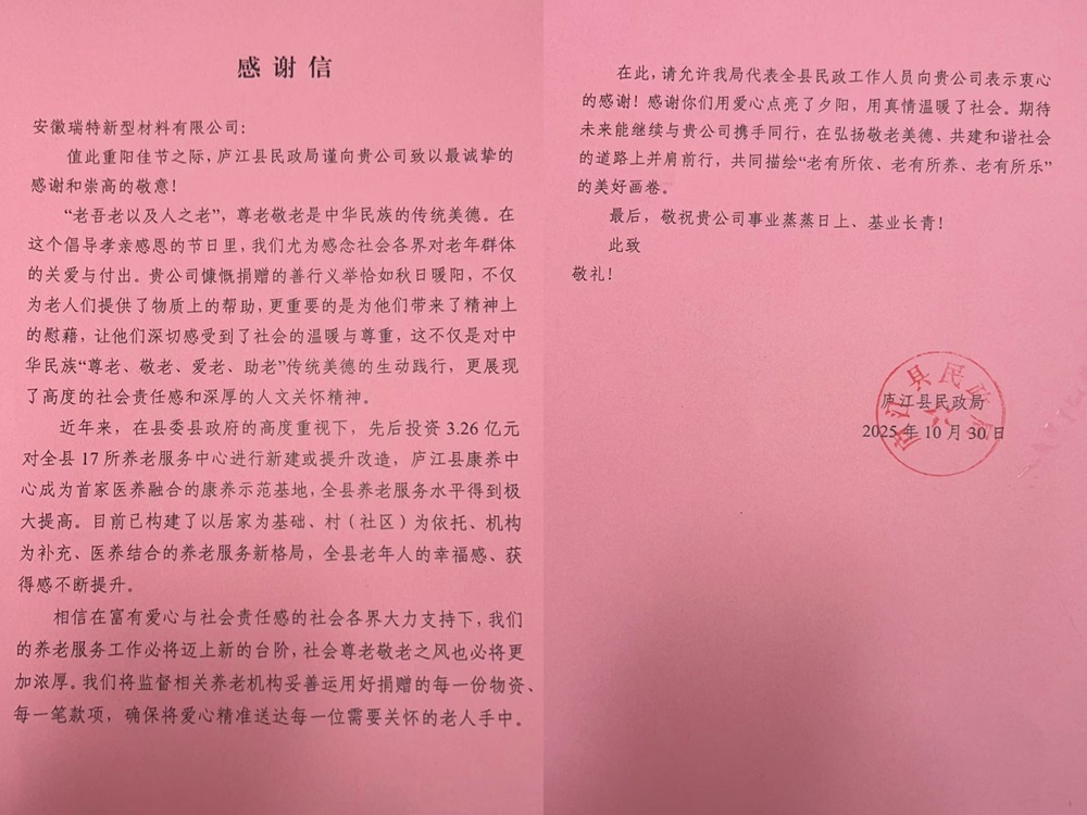 近日,安徽建工瑞特新材料科技有限公司收到來自廬江縣民政局的感謝信,對我司在重陽佳節(jié)期間開展的愛心敬老行動予以表彰和高度肯定。