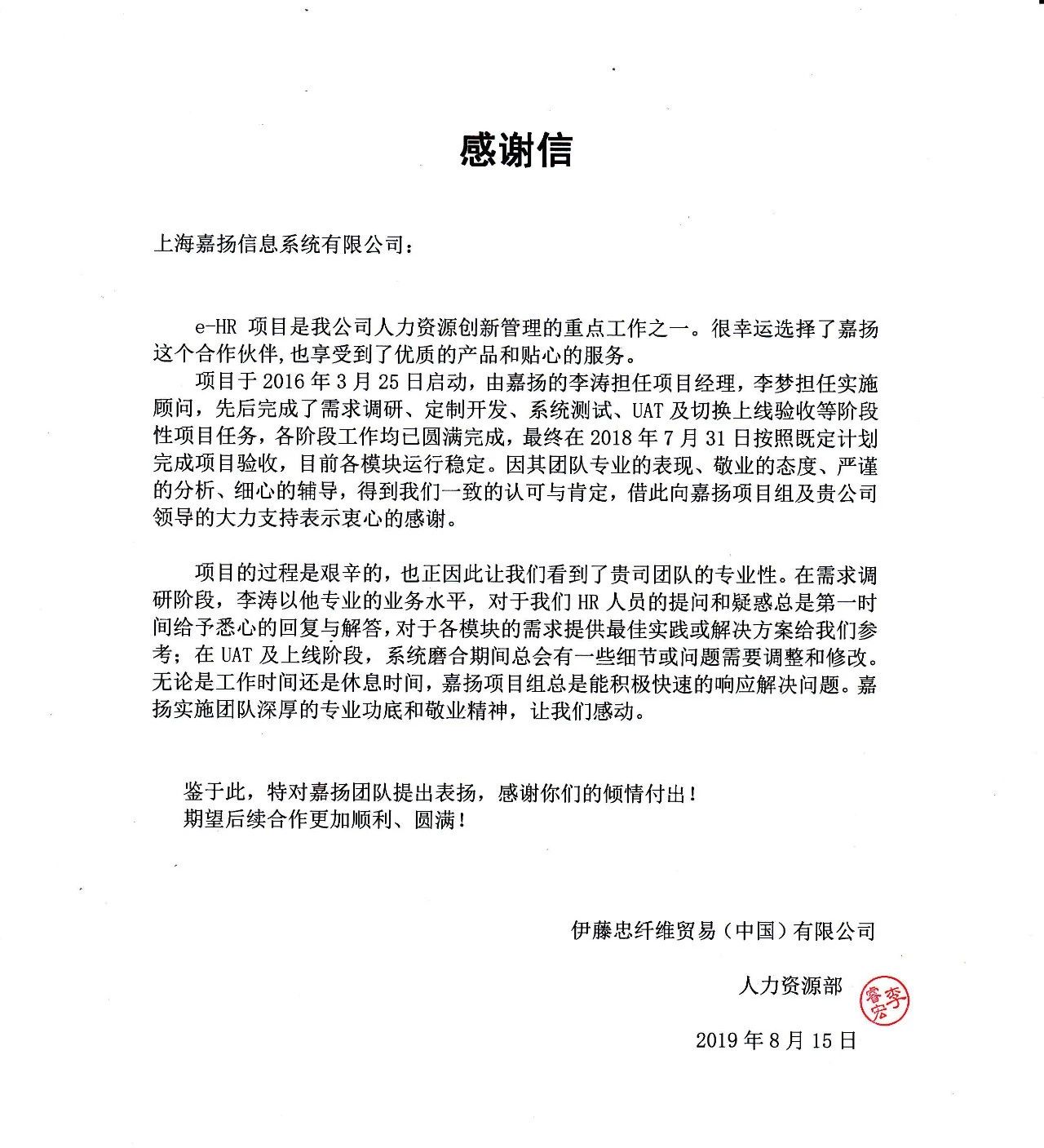 伊藤忠(中國(guó))項(xiàng)目涉及7大區(qū)域的分子公司,業(yè)務(wù)范圍涵蓋人力資源管理六大模塊,外加員工自助、工作流、自動(dòng)郵件,以及外部接口。對(duì)此,嘉揚(yáng)在對(duì)伊藤忠e-HR項(xiàng)目進(jìn)行詳細(xì)的需求調(diào)研的基礎(chǔ)上對(duì)項(xiàng)目進(jìn)行了切實(shí)可行的項(xiàng)目分期,并于2018年7月成功交付。經(jīng)過(guò)一年的使用,目前各模塊運(yùn)行穩(wěn)定。為此,伊藤忠特此發(fā)來(lái)感謝信,對(duì)嘉揚(yáng)團(tuán)隊(duì)的專(zhuān)業(yè)的表現(xiàn)、敬業(yè)的態(tài)度、嚴(yán)謹(jǐn)?shù)姆治?、?xì)心的輔導(dǎo)表示衷心的感謝。