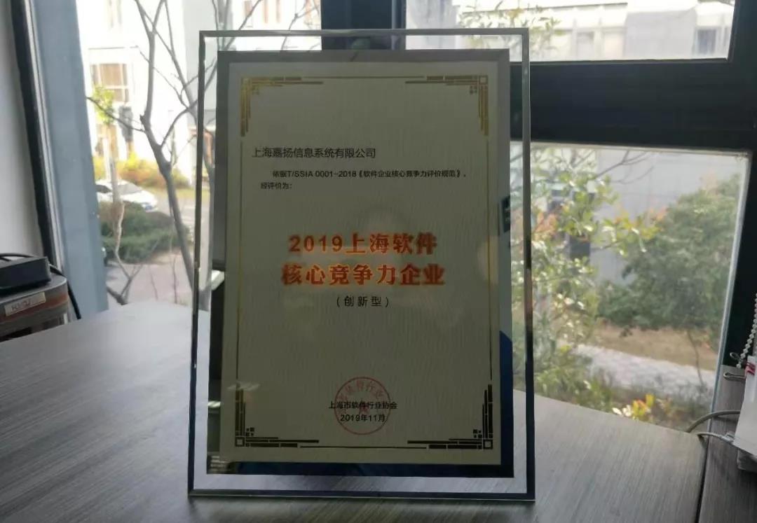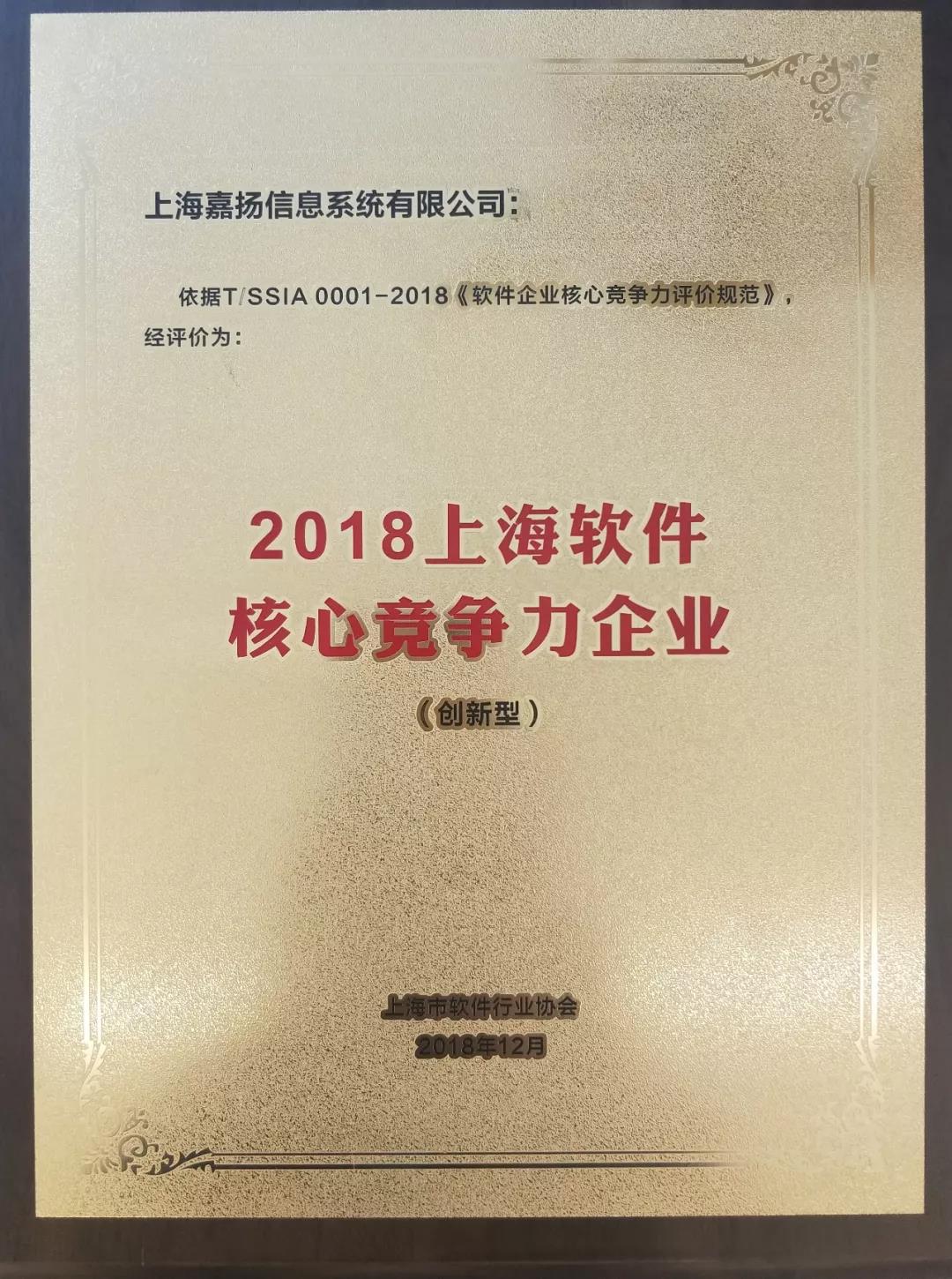 2019年12月4日,由上海市軟件協(xié)會主辦的2019上海軟件創(chuàng)新論壇(第11屆)在上海國際會議中心召開,上海嘉揚(yáng)信息系統(tǒng)有限公司受邀出席,并憑借領(lǐng)先的科技創(chuàng)新實力與的穩(wěn)步發(fā)展的市場規(guī)模,榮獲“2019上海軟件核心競爭力企業(yè)”稱號。