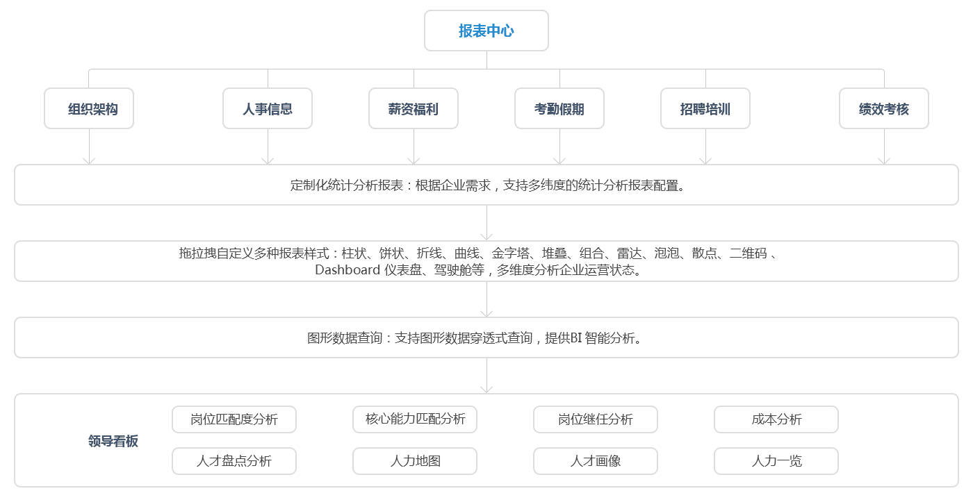 Reporting Center-Customize reports including organization structure report, BI report configuration, and report design.