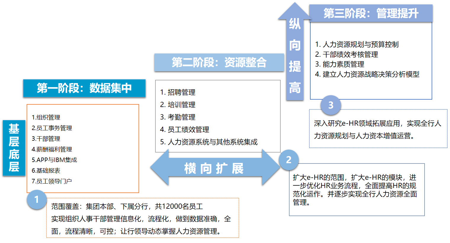 對(duì)于該行eHR項(xiàng)目實(shí)施計(jì)劃,嘉揚(yáng)給到的策略是:三步走策略,從數(shù)據(jù)集中到資源整合,再到管理提升,幫助XX銀行提高人力資源管理部門的服務(wù)能力,實(shí)現(xiàn)全行人力資源規(guī)劃和人力資本增值運(yùn)營(yíng)。